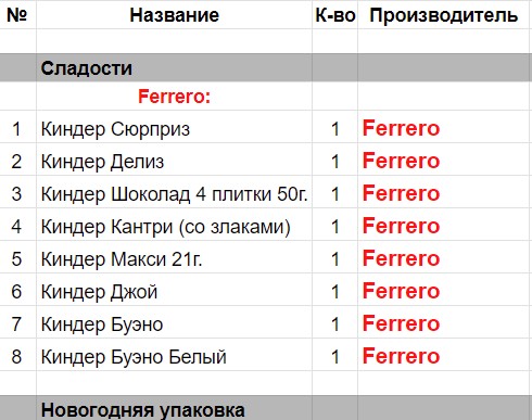 Киндер Сюрприз (1 шт), Киндер Джой (1 шт), Киндер Делис (1 шт), Киндер Шоколад 4 плиток 50г.(1 шт), Киндер Кантри (со злаками) (1 шт), Киндер Макси 21 г. (1 шт), Киндер Буэно (1 шт), Киндер Бонс (1 шт)