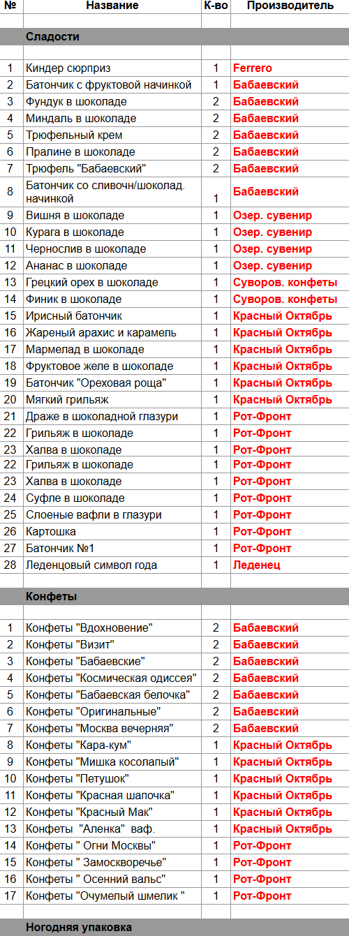 Драже в шоколадной глазури (1 шт), Грильяж в шоколаде (1 шт), Халва в шоколаде (1 шт), Суфле в шоколаде (1 шт), Слоеные вафли в глазури (1 шт), Картошка (1 шт), Батончик №1 (1 шт), Конфеты " Огни Москвы" (1 шт), Конфеты " Замоскворечье" (1 шт), Конфеты " Осенний вальс" (1 шт), Конфеты "Очумелый шмелик " (1 шт)